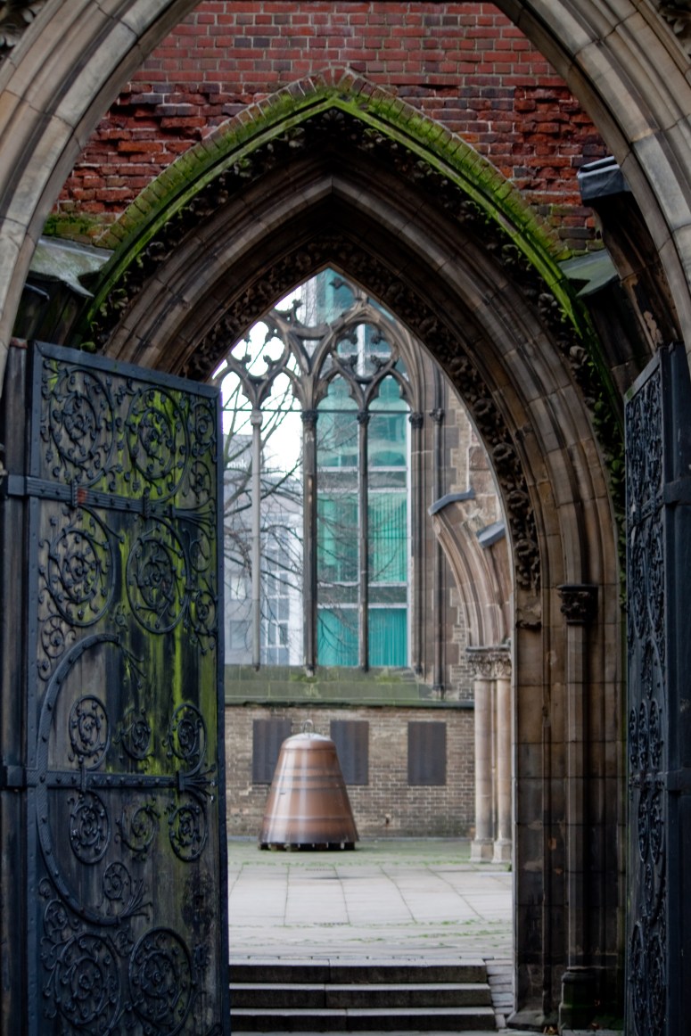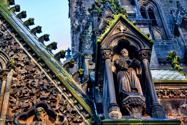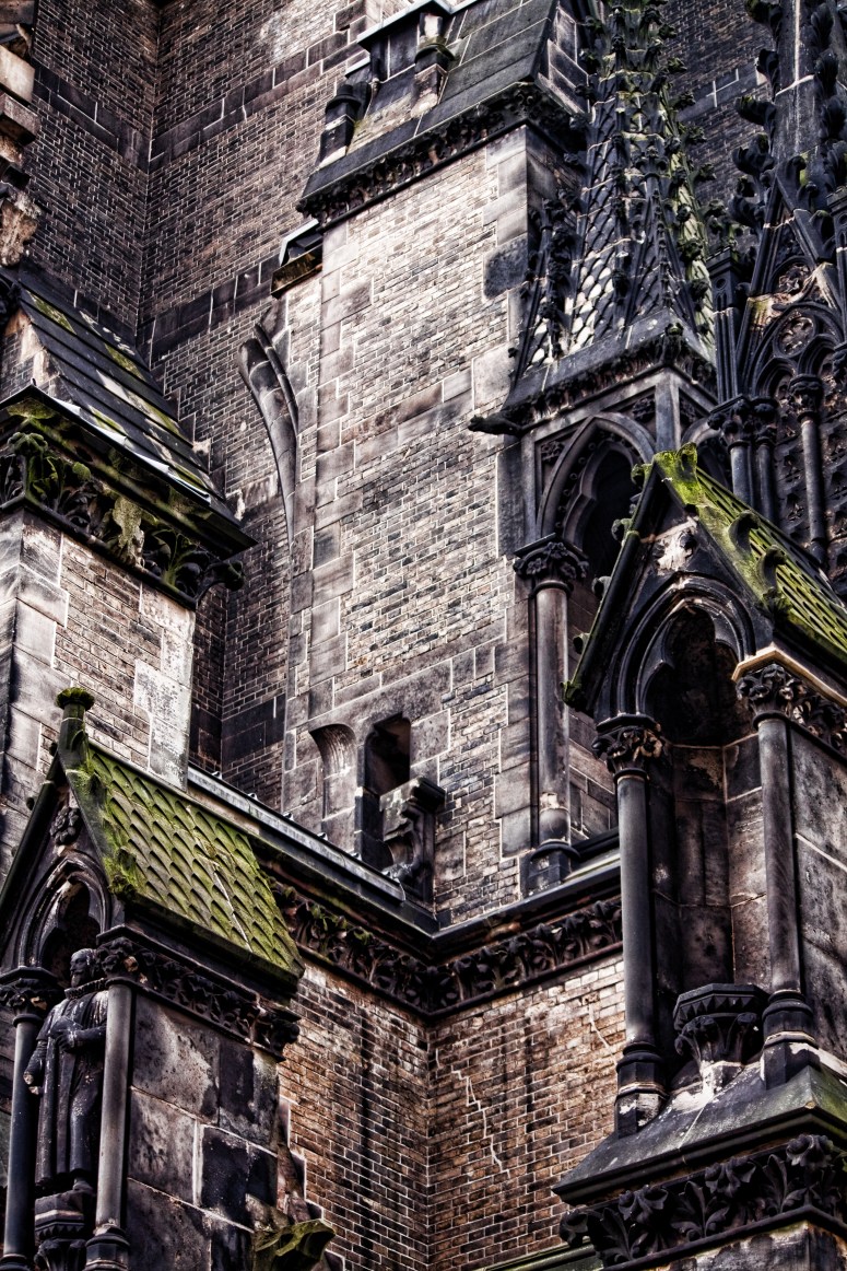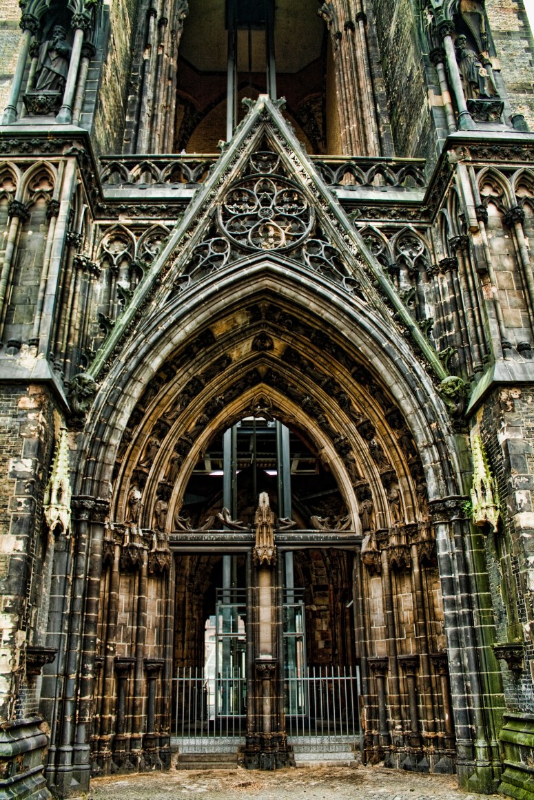 The Gothic Revival Church of St. Nicholas (St.-Nikolai-Kirche) was formerly one of the five Lutheran main churches in the city of Hamburg. It is now in ruins, serving as a memorial and an important architectural landmark. When The church was the tallest building in the world from 1874 to 1876 and is still the second-tallest building in Hamburg.The current condition of the Church of St. Nicholas is the result of air raids during World War II. The clearly visible spire of the Church of St. Nicholas served as a goal and orientation marker for the pilots of the Allied Air Forces during the extensive air raids on Hamburg. On 28 July 1943 the church was heavily damaged by aerial bombs. The roof collapsed and the interior of the nave suffered heavy damage. The walls began to show cracks, yet neither they nor the spire collapsed.The English architect George Gilbert Scott, who was an expert for the restoration of medieval churches and an advocate of the gothic architectural style, was commissioned to devise a new design. He designed an 86 meter-long nave, with a 28 meter-high vault. The architecture was strongly influenced by French and English gothic styles, though the pointed spire is typically German. The amount of sculptures made from sandstone in the interior and on the spire was unusual.I made several trips to St. Nikolai while I was in Hamburg. It was a reminder that not even something sacred can escape the destructive powers of war.The once grand church doors now open onto rubble and debris.Even though much of the Church now lay in ruin, it is still very beautiful and impressive.