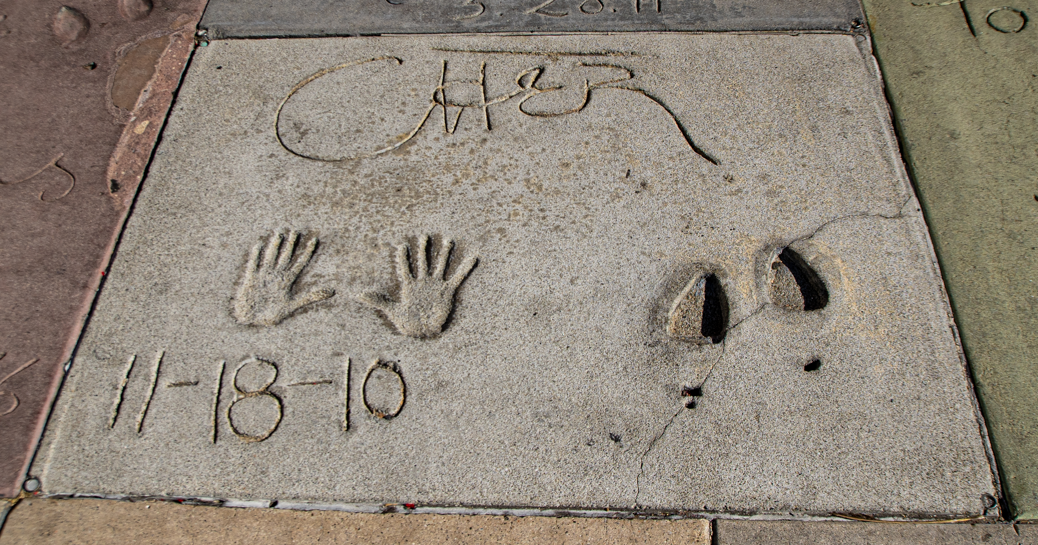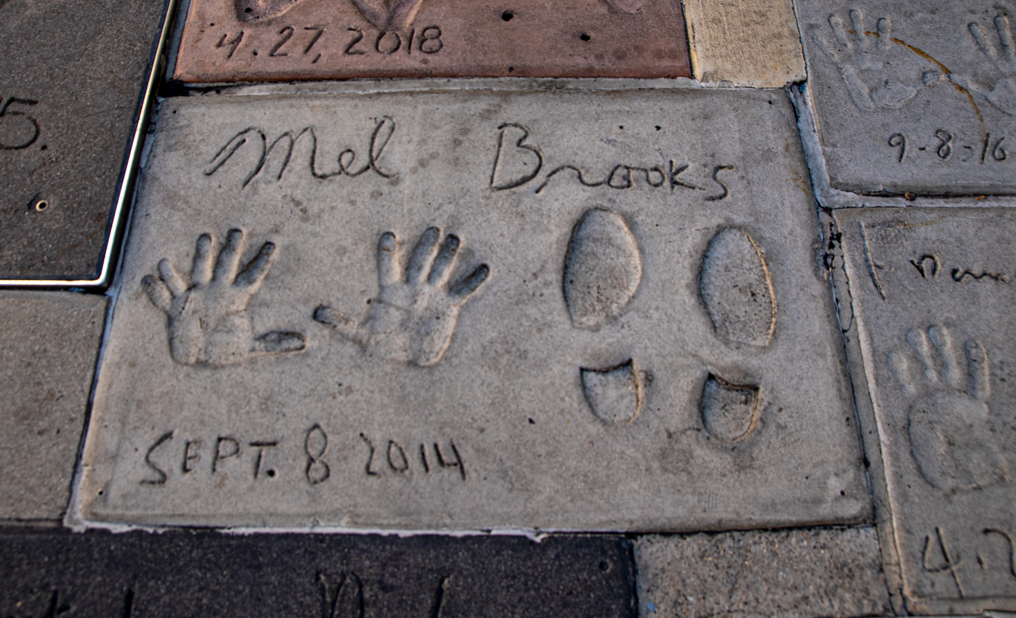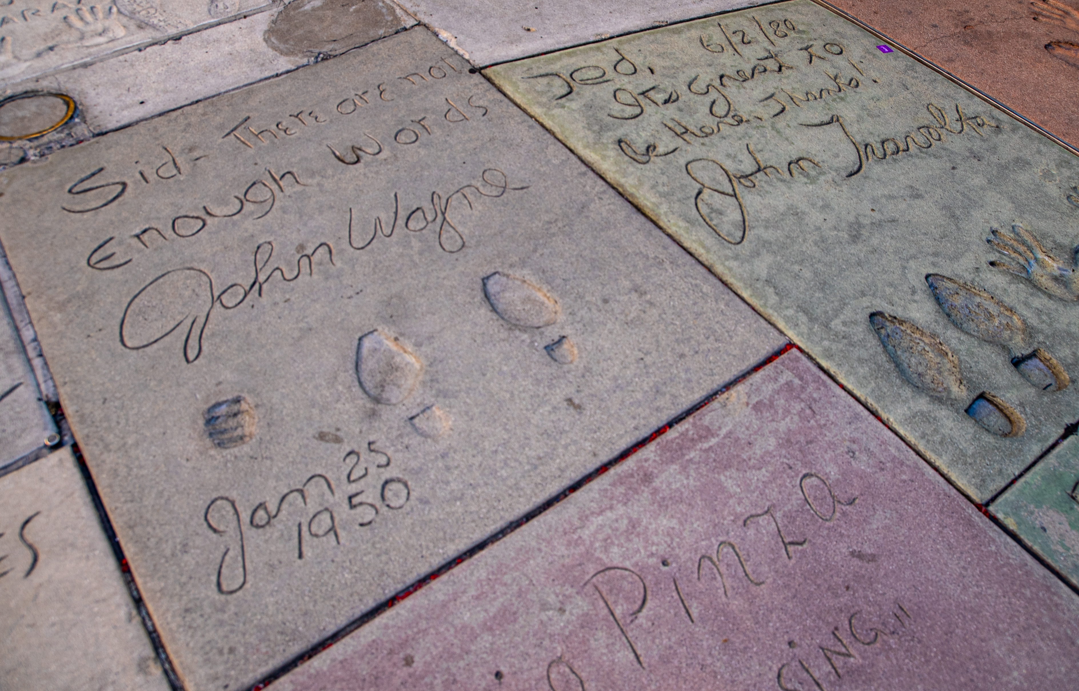 Here you can see the handprints of John Wayne along with his fist. Whoopi Goldberg pushed a dreadlock into her cement and Mel Brooks wore a sixth finger on his right hand. Not all of the handprints are on display at any one time. With several hundred prints having been done, there are always some being repaired and just in storage.