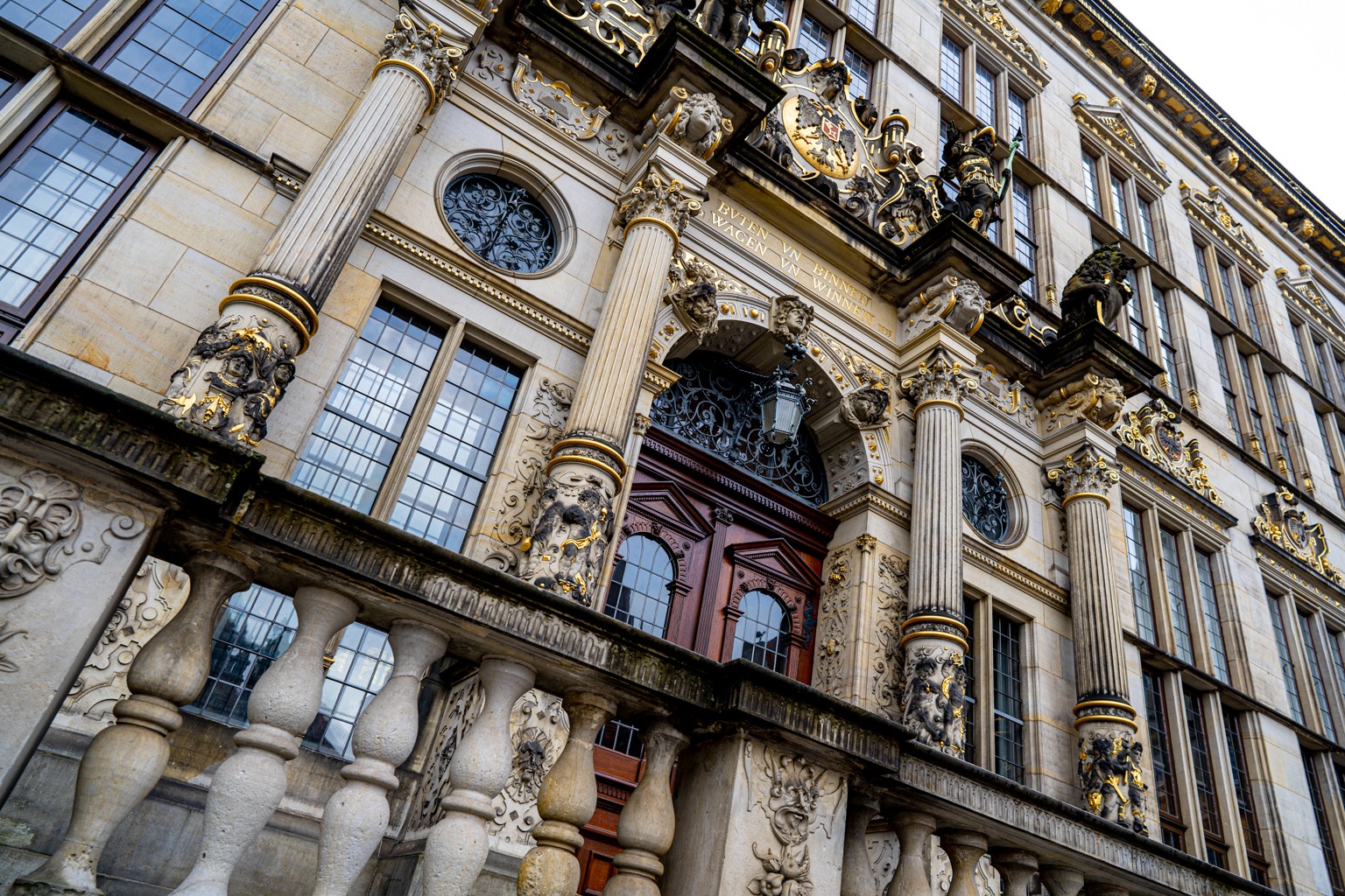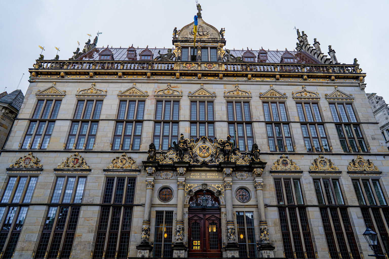 The Flemish Renaissance building features the Bremen Merchants’s coats of arms and the Holy Roman Imperial Eagle.