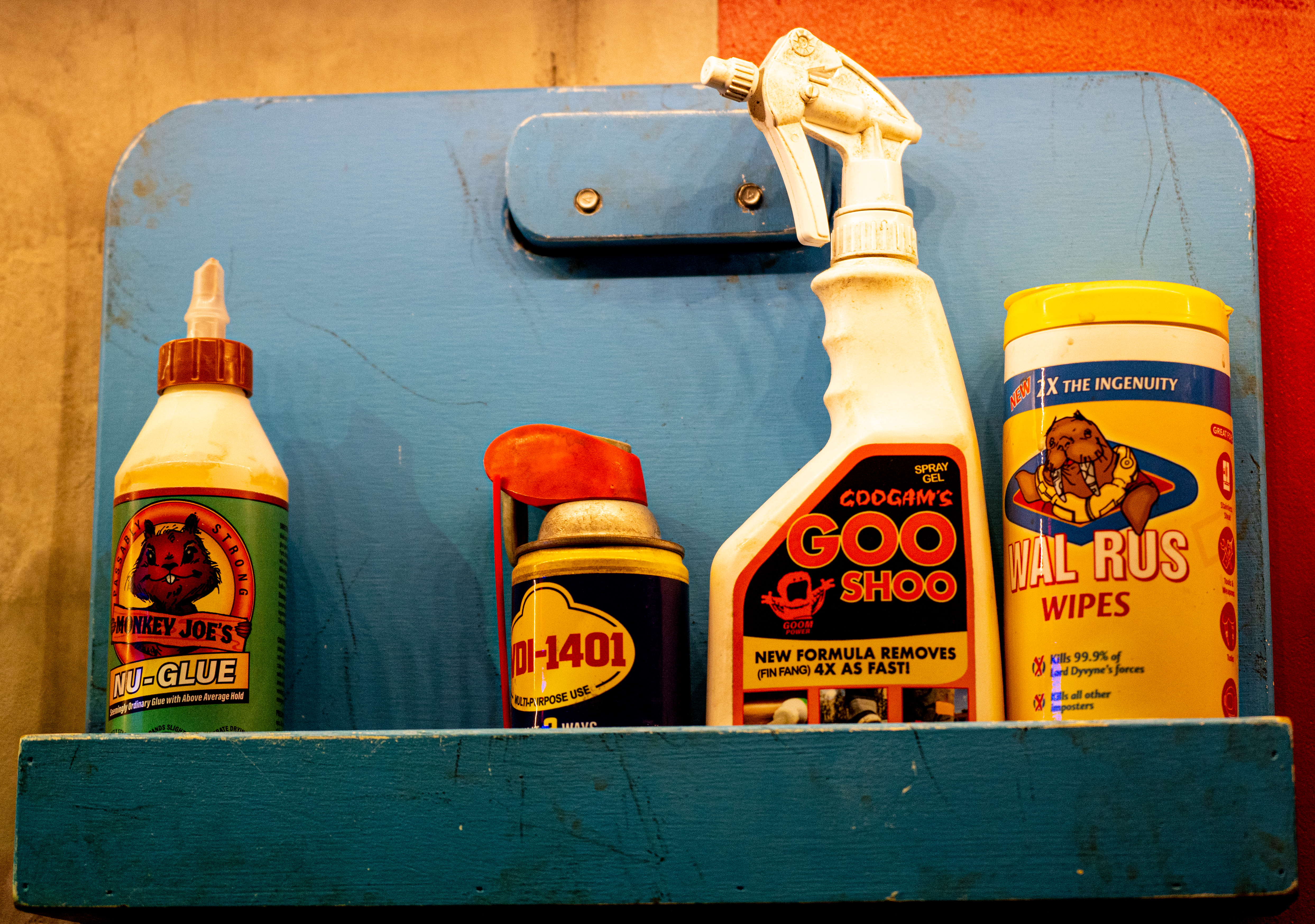 Even the cleaning supplies in WEB Slingers may hide a secret. Do you know characters Monkey Joe, Wal Rus, and Goom? WDI 1401 is a reference to Walt Disney Imagineering at 1401 Flower Street, Glendale, Ca.