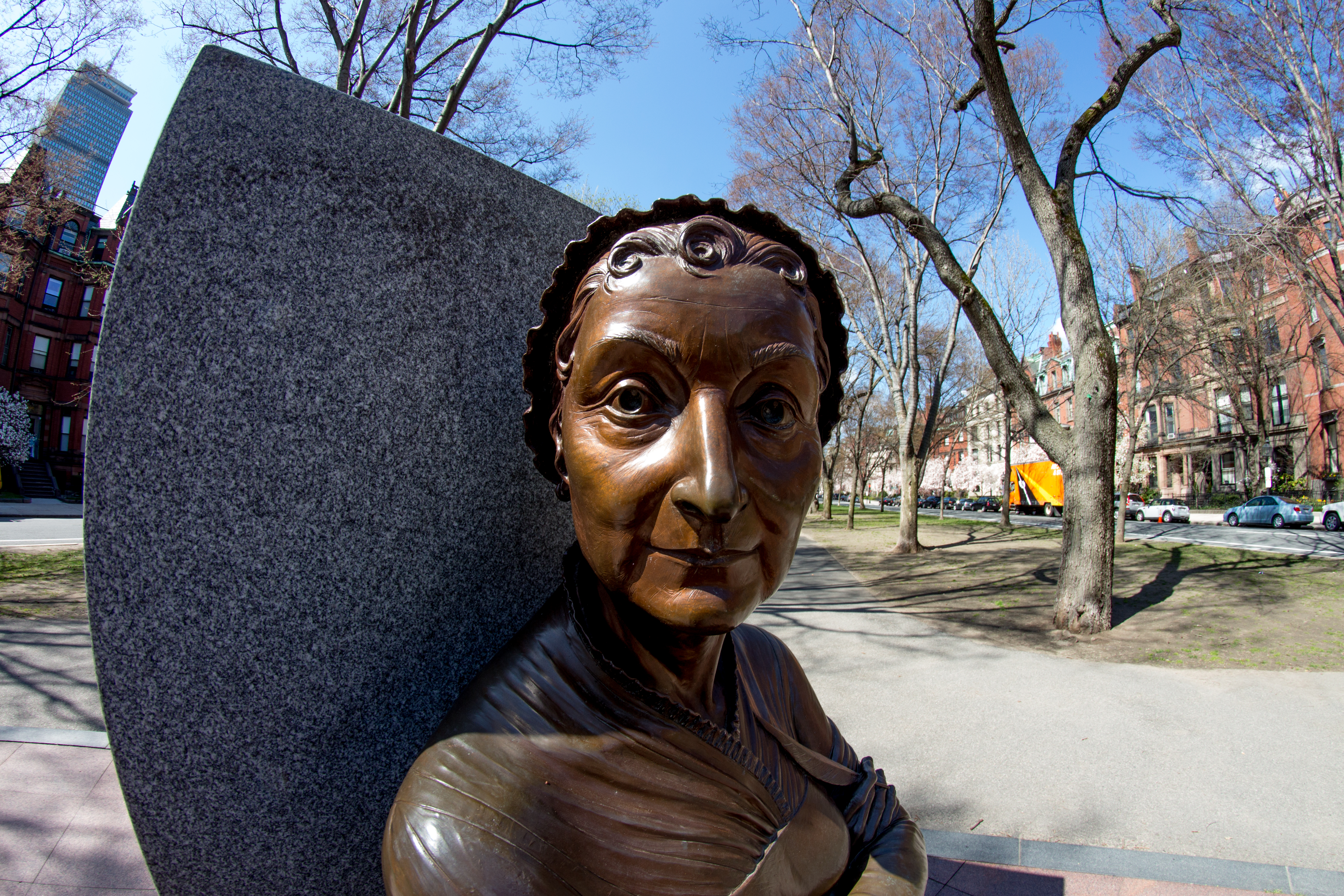 Walking along the mall at Commonwealth Ave, one encounters a number of sculptures representing some of Boston’s noteworthy citizens. Merdith Bergmann’s The Boston Women’s Memorial features likenesses of Lucy Stone, Phillis Wheatley and Abigail Adams,